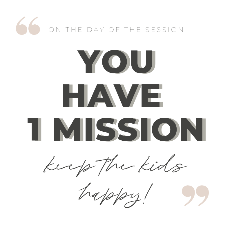 When the day of the session arrives this is your goal… KEEP THE KIDS HAPPY! Do whatever it takes to keep your kids happy. Give them lots of play time and one-on-one time before the session. Make sure they are fed and try to get them to nap. Even if that means driving them around in a car for a few hours. Remind them again about what’s going to be happening and how its going to be awesome. And bring whatever you bribed them with WITH YOU! If you promised them a paw patrol character, buy it ahead of time and keep it in the car. Kids brains doing know how to process delayed gratification and so we must immediately reward them with things as soon as it happens. For younger kids, I even recommend bringing gummi snacks, goldfish, puffs, or some sort of small bribe that you can give them in between shots! Just make sure its not something that will melt or bleed color onto their clothes (like m & m’s). Word to the wise, if you do not want them to have a sucker stick hanging out of their mouth… don’t give it to them during the session! If you don’t want them to be holding the toy in all the images, do not give it to them during the session! Know that I typically do anything that involves kids first so that they can be done ASAP and have their rewards!